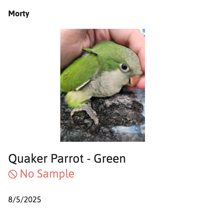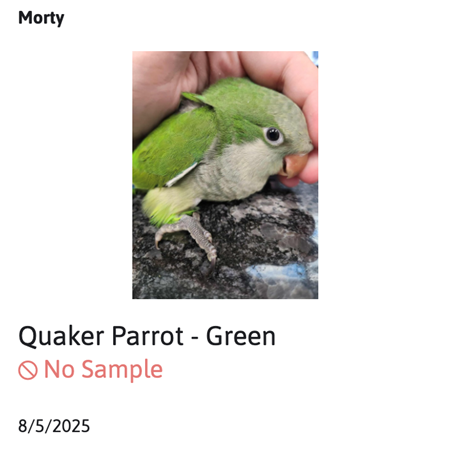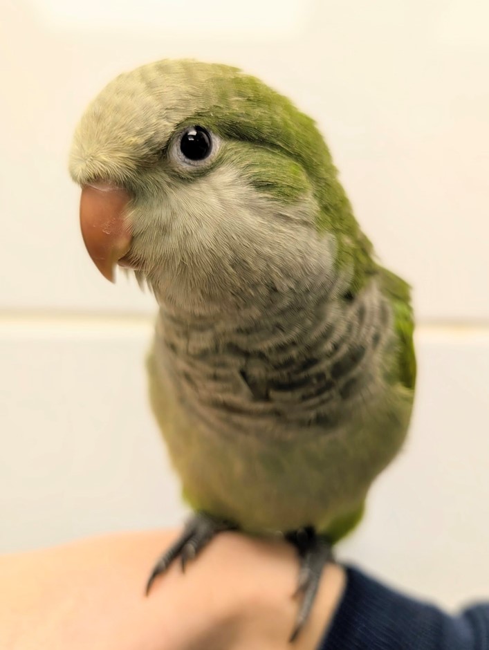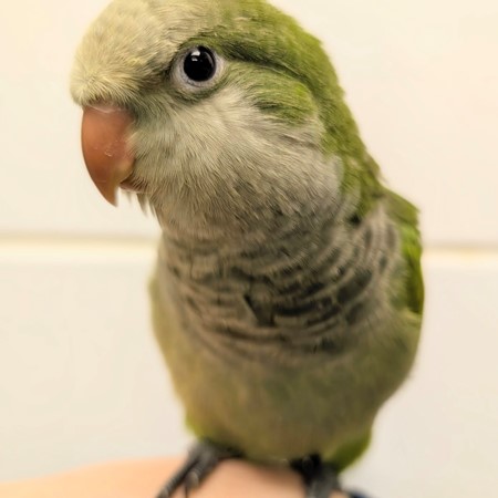 Say hello to Morty, our affectionate baby Green Quaker! Morty loves to climb on your shoulder and snuggle, it's just the cutest! They also love head scratches and pets, so we can't wait to find them a home that will give them all their attention! Socialization starts at 4 weeks of age, and we have our birds live with us until they have begun the socialization process