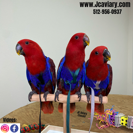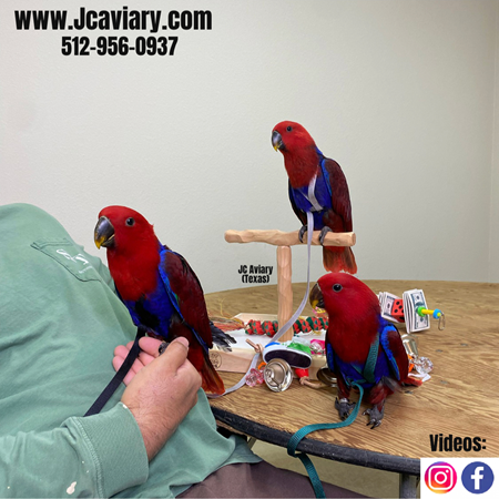Incredibly sweet and fully trained Eclectus babies ready now for their forever homes. They are weaned on a healthy diet of organic pellets and vegetables. All our babies are very well socialized, tame and sweet. Please visit our website for full detailed info on these babies -- www.Jcaviary.com-- Please call us to reserve your baby !! 512-956-0937 - Shipping available via Delta Airlines-- All babies are DISEASE TESTED and come with avian vet documents as well. (Deposit: $1500 required to reserve each baby) Videos available on Facebook: https://facebook.com/jcaviary