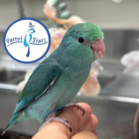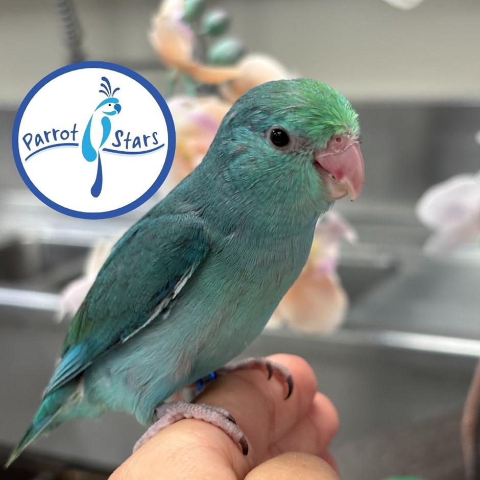 Baby Turquoise Pacific Parrotlet (Forpus coelestis) Available! Parrotlets are one of the smallest "true parrots". Parrotlets come in a wide variety of color mutations. They can be a great starter bird for new bird owners. Don't let their small size fool you, because they have giant personalities and are extremely intelligent. They are bold, sassy, sweet and affectionate. Some can even learn to talk. At Parrot Stars we focus on education, nutrition, and conservation. We work very hard to help educate our customers on parrot companionship. Prior to taking a bird home, we will provide information on proper housing, creating a safe environment, diet, behavior, hormones and much more. No question will go unanswered. Every hand fed baby is weaned on to a high variety diet. They are weaned onto fruits and veggies, a soak and sprout mix made here in store, high variety seed mix that is also made in store, and naturally colored pellets. If you have questions regarding this baby, or any others that we have available, please give us a call! Feel free to follow us on Facebook @parrotstars for more pictures, videos and information.