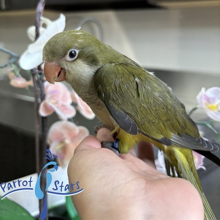 Baby Olive Quaker Parrot (Myiopsitta monachus) Available! Quakers (also called Monk Parakeets) have boisterous personalities. They are energetic, goofy and playful. They can learn to talk and typically love affection. They enjoy being out of the cage and can make strong bonds with their human companions. Quakers can make wonderful "starter birds" but also can be a wonderful addition to an existing flock. At Parrot Stars we focus on education, nutrition, and conservation. We work very hard to help educate our customers on parrot companionship. Prior to taking a bird home, we will provide information on proper housing, creating a safe environment, diet, behavior, hormones and much more. No question will go unanswered. Every hand fed baby is weaned on to a high variety diet. They are weaned onto fruits and veggies, a soak and sprout mix made here in store, high variety seed mix that is also made in store, and naturally colored pellets. If you have questions regarding this baby, or any others that we have available, please give us a call! Feel free to follow us on Facebook @parrotstars for more pictures, videos and information.