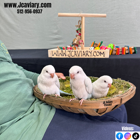 Incredibly sweet, hand-fed, tame blue pallid OPALINE quaker parrots babies ready now for their forever homes. They are weaned on a healthy diet of organic pellets and vegetables. All our babies are very well socialized, tame and sweet. Please visit our website for full detailed info on these babies -- www.Jcaviary.com-- Please call us to reserve your baby !! 512-956-0937 - Shipping available via Delta Airlines-- All babies are DISEASE TESTED and come with avian vet documents as well. (Deposit: $300 required to reserve each baby) Videos available on Facebook: https://facebook.com/jcaviary