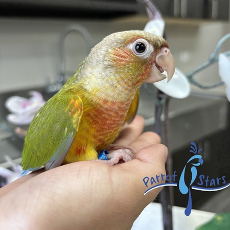 Baby Pineapple Green Cheek Conure (Pyrrhura molinae) Available! Green Cheek Conures are native to South America. GCCs come in a wide variety of color mutations. Green Cheeks are great family birds and are known for their loving, clownish and curious personalities. They are extremely playful and love to be out of the cage and with their human companions. We consider GCCs a great "starter bird" they do not have an intense noise level and they are a great size. As with any parrot companion, training is required but we are here to help!! At Parrot Stars we focus on education, nutrition, and conservation. We work very hard to help educate our customers on parrot companionship. Prior to taking a bird home, we will provide information on proper housing, creating a safe environment, diet, behavior, hormones and much more. No question will go unanswered. Every hand fed baby is weaned on to a high variety diet. They are weaned onto fruits and veggies, a soak and sprout mix made here in store, high variety seed mix that is also made in store, and naturally colored pellets. If you have questions regarding this baby, or any others that we have available, please give us a call! Feel free to follow us on Facebook @parrotstars for more pictures, videos and information.