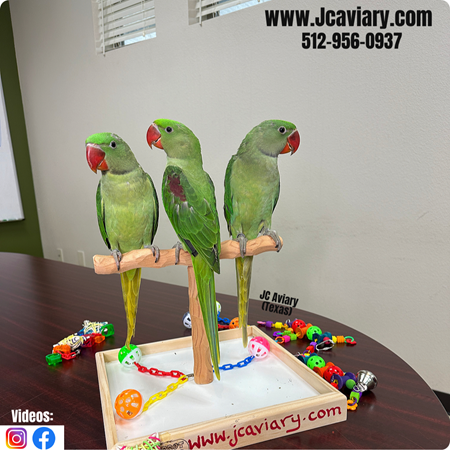 Incredibly sweet and fully trained Alexandrine parrot babies ready now for their forever homes. DNA tested male and 2 Females. They are weaned on a healthy diet of organic pellets and vegetables. All our babies are very well socialized, tame and sweet. Please visit our website for full detailed info on these babies -- www.Jcaviary.com-- Please call us to reserve your baby !! 512-956-0937 - Shipping available via Delta Airlines-- All babies are DISEASE TESTED and come with avian vet documents as well. (Deposit: $1500 required to reserve each baby) Videos available on Facebook: https://facebook.com/jcaviary
