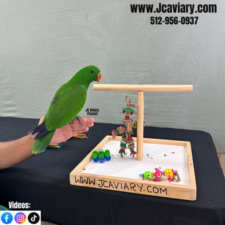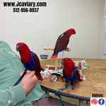 Incredibly sweet, hand-fed, tame and fully trained Male Eclectus baby ready now for his forever homes. He is weaned on a healthy diet of organic pellets and vegetables. All our babies are very well socialized, tame and sweet. Please visit our website for full detailed info on these babies -- www.Jcaviary.com-- Please call us to reserve your baby !! 512-956-0937 - Shipping available via Delta Airlines-- All babies are DISEASE TESTED and come with avian vet documents as well. (Deposit: $2500 required to reserve each baby) Videos available on Facebook: https://facebook.com/jcaviary