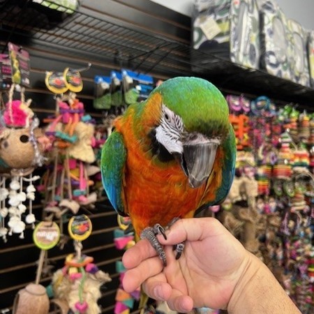 Hand tame beautiful Catalina Macaw Hybrid adult, this is a cross between a Blue & Gold Macaw and a Scarlett Macaw making this beautiful and colorful Hybrid Macaw. We offer financing go to birdmansparrots.com and apply today or call 773-317-3785.