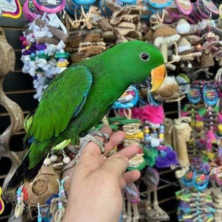 Hand fed and very tame and friendly baby Solomon Island Eclectus male available. We offer financing go to birdmansparrots.com and apply today or call 773-317-3785.