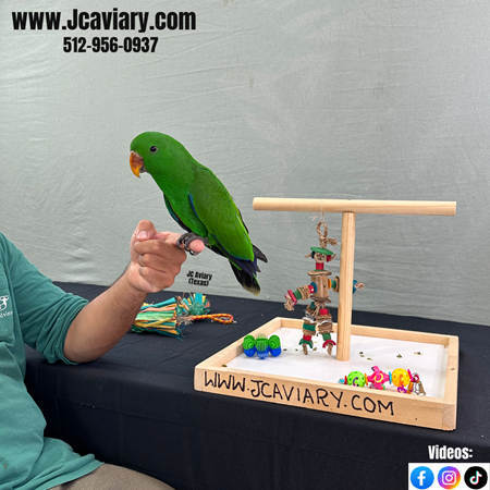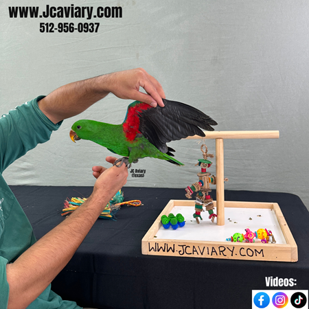 Incredibly sweet, hand-fed, tame and fully trained Male Eclectus baby ready now for his forever homes. He is weaned on a healthy diet of organic pellets and vegetables. All our babies are very well socialized, tame and sweet. Please visit our website for full detailed info on these babies -- www.Jcaviary.com-- Please call us to reserve your baby !! 512-956-0937 - Shipping available via Delta Airlines-- All babies are DISEASE TESTED and come with avian vet documents as well. (Deposit: $2500 required to reserve each baby) Videos available on Facebook: https://facebook.com/jcaviary
