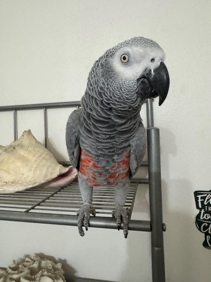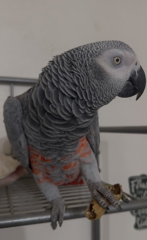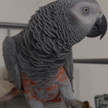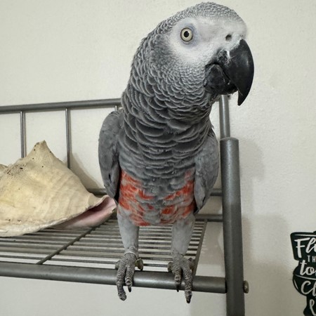 Female Congo African Grey. 10 years old. She can be a pet, although not handled as much recently. Banded DNA sexed and disease tested. Of note, she is blind on her left eye from an old injury.