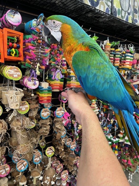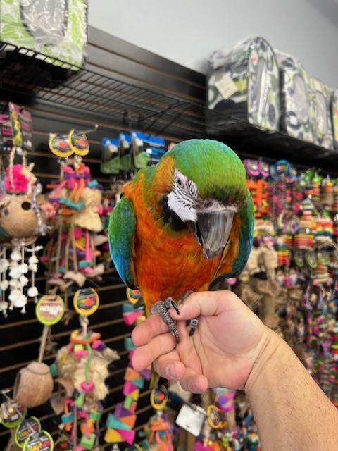 Hand tame beautiful Catalina Macaw Hybrid adult, this is a cross between a Blue & Gold Macaw and a Scarlett Macaw making this beautiful and colorful Hybrid Macaw. We offer financing go to birdmansparrots.com and apply today or call 773-317-3785.