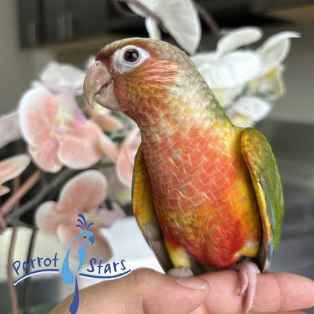 Baby Pineapple Green Cheek Conure (Pyrrhura molinae) Available! Green Cheek Conures are native to South America. GCCs come in a wide variety of color mutations. Green Cheeks are great family birds and are known for their loving, clownish and curious personalities. They are extremely playful and love to be out of the cage and with their human companions. We consider GCCs a great "starter bird" they do not have an intense noise level and they are a great size. As with any parrot companion, training is required but we are here to help!! At Parrot Stars we focus on education, nutrition, and conservation. We work very hard to help educate our customers on parrot companionship. Prior to taking a bird home, we will provide information on proper housing, creating a safe environment, diet, behavior, hormones and much more. No question will go unanswered. Every hand fed baby is weaned on to a high variety diet. They are weaned onto fruits and veggies, a soak and sprout mix made here in store, high variety seed mix that is also made in store, and naturally colored pellets. If you have questions regarding this baby, or any others that we have available, please give us a call! Feel free to follow us on Facebook @parrotstars for more pictures, videos and information.