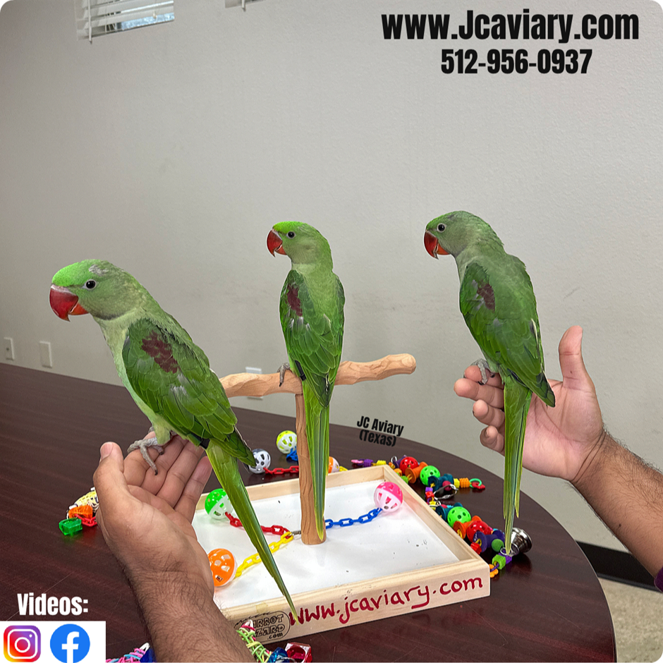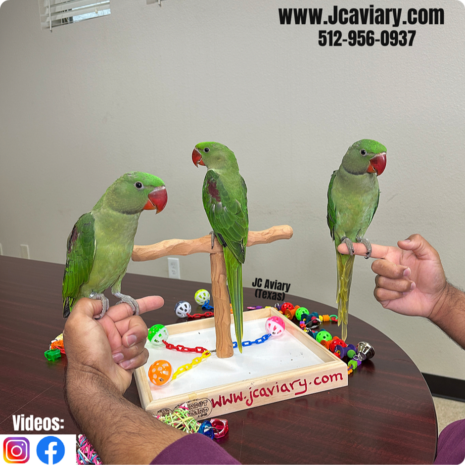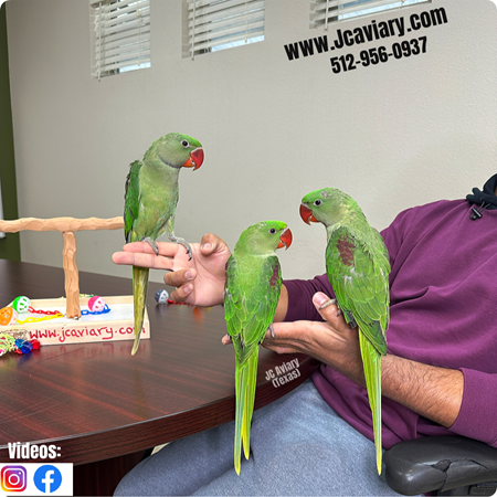 Incredibly sweet and fully trained Alexandrine parrot babies ready now for their forever homes. They are weaned on a healthy diet of organic pellets and vegetables. All our babies are very well socialized, tame and sweet. Please visit our website for full detailed info on these babies -- www.Jcaviary.com-- Please call us to reserve your baby !! 512-956-0937 - Shipping available via Delta Airlines-- All babies are DISEASE TESTED and come with avian vet documents as well. (Deposit: $1500 required to reserve each baby) Videos available on Facebook: https://facebook.com/jcaviary
