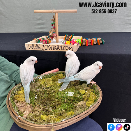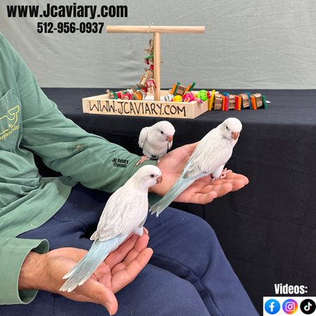 Incredibly sweet, hand-fed, tame blue pallid OPALINE quaker parrots babies ready now for their forever homes. They are weaned on a healthy diet of organic pellets and vegetables. All our babies are very well socialized, tame and sweet. Please visit our website for full detailed info on these babies -- www.Jcaviary.com-- Please call us to reserve your baby !! 512-956-0937 - Shipping available via Delta Airlines-- All babies are DISEASE TESTED and come with avian vet documents as well. (Deposit: $300 required to reserve each baby) Videos available on Facebook: https://facebook.com/jcaviary