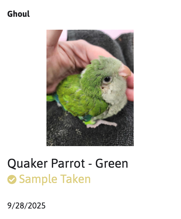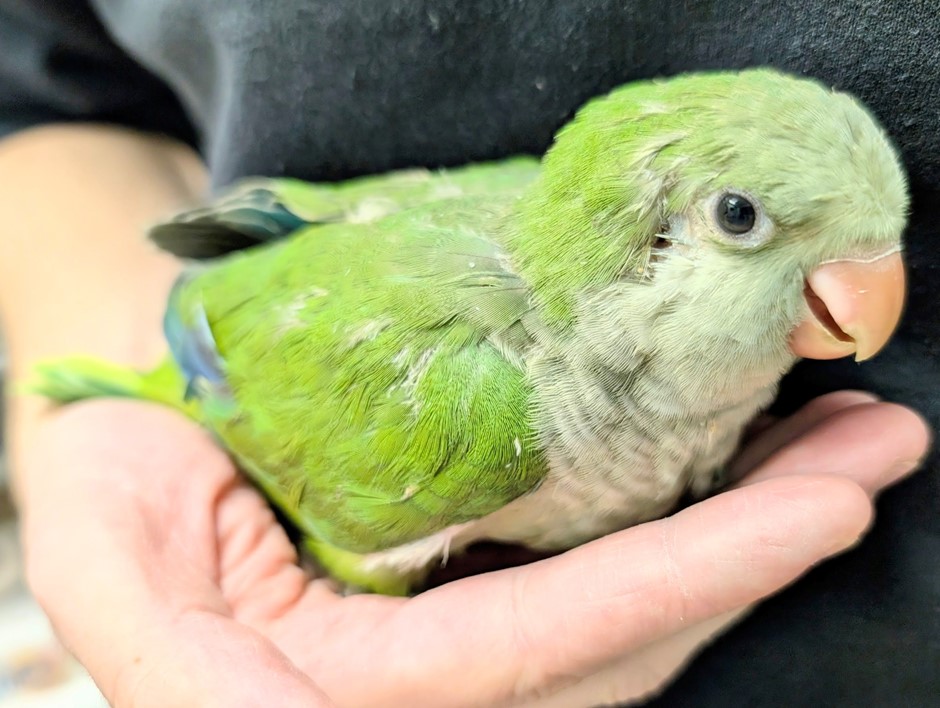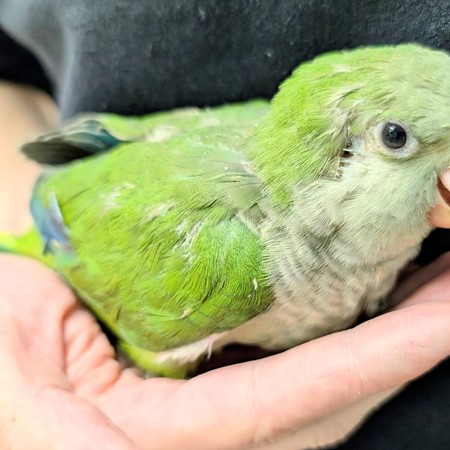 Say hello to Ghoul, our Green Quaker! Ghoul is super friendly and loves cuddles, so we are looking for a loving family who will give them tons of head skritches and attention! Come say hello to Ghoul and see if they are the perfect feathery companion for you! Socialization starts at 4 weeks of age, and we have our birds live with us until they have begun the socialization process