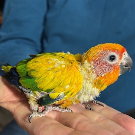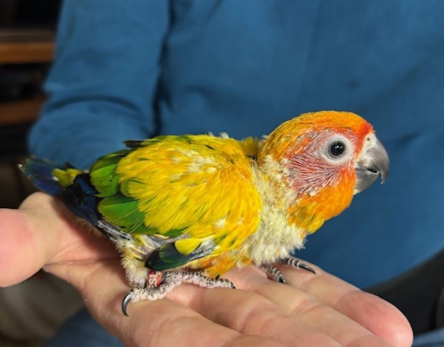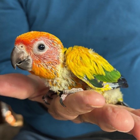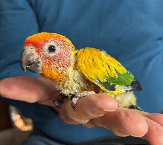 High Yellow Sun Conure - DNA Male - being hand fed at this time - $550 weaned - will be weaned to eat a pellet diet - $50 deposit will hold this bird until it is weaned and eating well on its own and ready to be shipped. Shipping is with Delta for $165 and the shipping container is $35. Payment through Zelle or PayPal. 1165