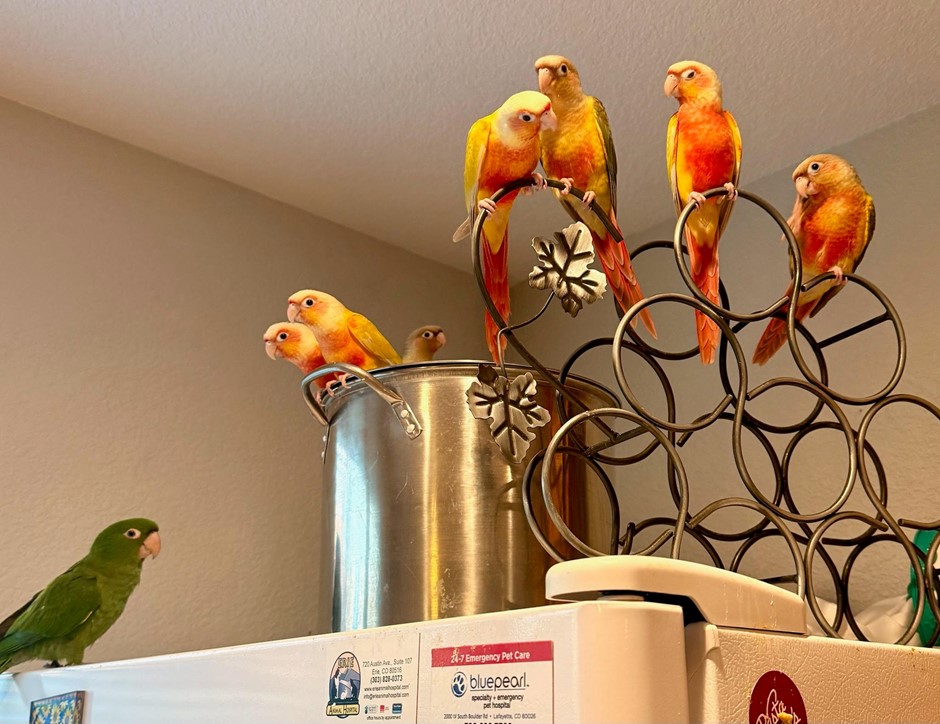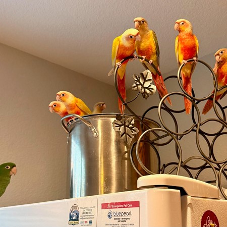 Baby Sun Cheeks (650) and Pineapples (450) Fully Flighted and weaned on Zupreem Natural Pellets.