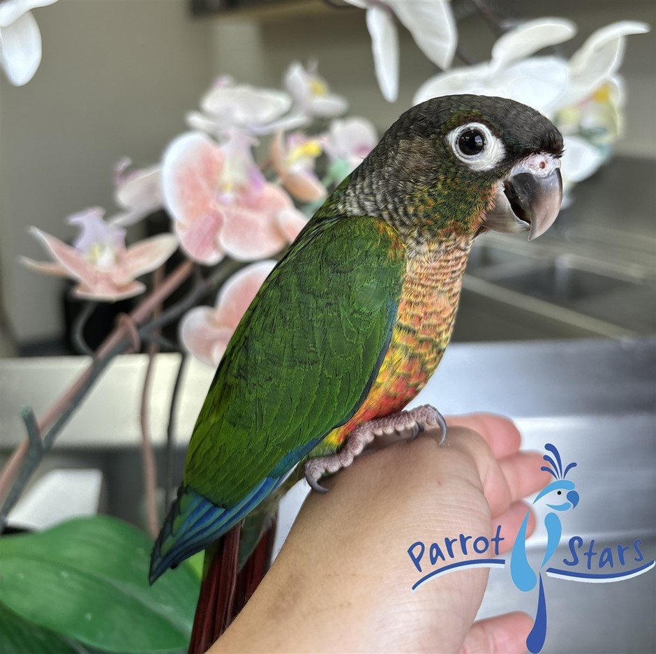 Baby Yellow Sided Green Cheek Conure (Pyrrhura molinae) Available! Green Cheek Conures are native to South America. GCCs come in a wide variety of color mutations. Green Cheeks are great family birds and are known for their loving, clownish and curious personalities. They are extremely playful and love to be out of the cage and with their human companions. We consider GCCs a great "starter bird" they do not have an intense noise level and they are a great size. As with any parrot companion, training is required but we are here to help!! Ideally, the minimum cage size for this bird would be 25’’ long, 21’’ wide and 29’’ high with ½’’ wire spacing. At Parrot Stars we focus on education, nutrition, and conservation. We work very hard to help educate our customers on parrot companionship. Prior to taking a bird home, we will provide information on proper housing, creating a safe environment, diet, behavior, hormones and much more. No question will go unanswered. Every hand fed baby is weaned on to a high variety diet. They are weaned onto fruits and veggies, a soak and sprout mix made here in store, high variety seed mix that is also made in store, and naturally colored pellets. If you have questions regarding this baby, or any others that we have available, please give us a call! Feel free to follow us on Facebook @parrotstars for more pictures, videos and information. 1