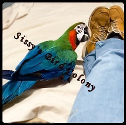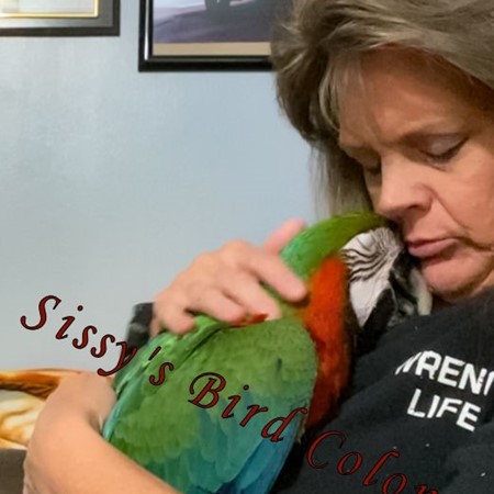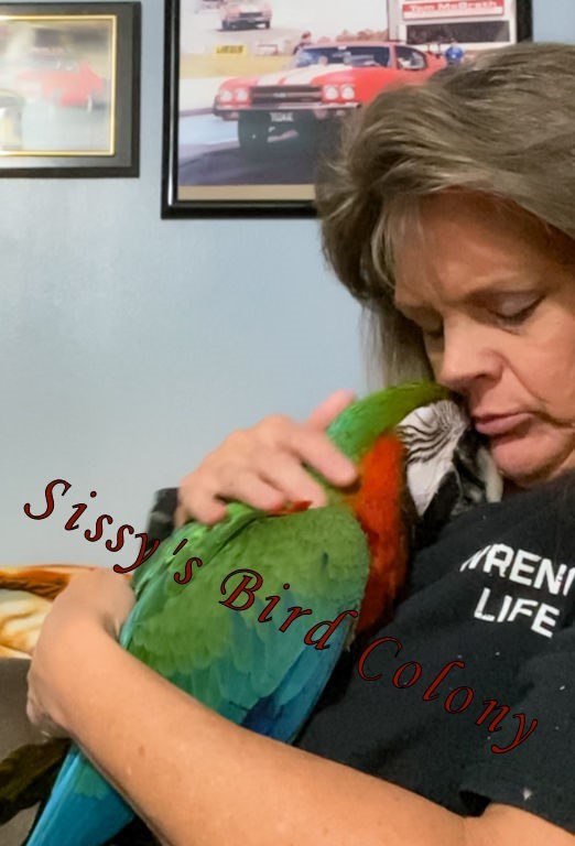 Hand Raised and totally spoiled Harlequin Macaw. He's such a sweet boy and I can't help myself but to brag on him. Now where to start.... He loves getting as much attention as he can. He's the one that could be glued to you for that attention. On the two pictures above (snuggling) this is what he did. He was sitting quietly on his tree stand and when I walked in the room, sat down in my recliner with my feet up. He flew down walked over to me trying to find his way up, lowered my leg and he climbed up my jeans and into my lap so he can get attention. He absolutely loves to have his head scratched. Cuddling up on my lap he wanted to snuggle. He will put his head under my chin and lay flat to my body as he's getting petted. He's always loves being held. Even with all the loves an snuggles he really enjoys playing with you. Sitting on the floor he will walk up to me and hold his foot up and place it so gently in my hand. He wants me to roll him over and play. Laying on his back, his feet playing back an forth with my hand and the other hand in his mouth. He's very gentle when my hand or fingers are in his mouth. If for some chance he adds a little pressure from the excitement of playing I will simply tell him easy and he will stop the pressure or just release. I can get both feet and swing him back an forth easy while he was on his back. He loves playing with the dogs toys, roll a ball (sm or Lg) tug a war with a rag or toy. Then he can also find enjoyment by chewing on my shoe strings if I let him. Has started saying some words, Mama, Hello, peek a boo. Oh and he's so funny when I play peek a boo with him. Sitting on the floor he'll start walking around me, looking for something to put in his mouth :), as he starts coming around the other side I will turn back and say peek a boo and turn back as to hide my face, He comes walking around the side of me with his body leaning outward neck stretched around trying to see me, then I do it again, He gets so excited he'll jump and run to the front of me to try and see my face that I've covered with my hands. Just like you would play with a child doing this. I just couldn't stop laughing at the reaction he gives. My stories can go on and on about him. I want to find someone that will spend time with him. He's not the type to stay in a cage all day. His personality is so amazing, extremely sweet an loving, playful, and one that you just can't help yourself but to laugh at the stuff he does. This bird is for the one that really wants to spend time with a large bird as it would be just like a child at times and other times like a puppy. He's young enough to learn so much more. Make sure you have the time he needs to live a long and happy life.