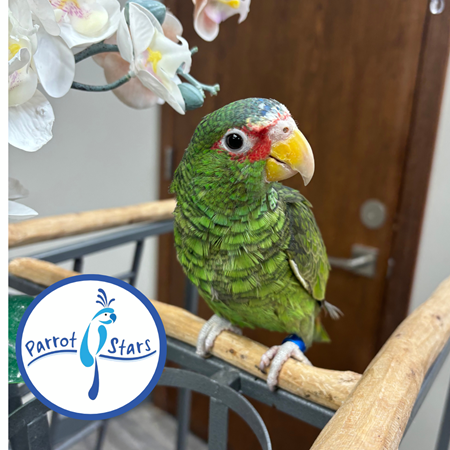 "Scientific Name: Amazona albifrons Native Range: Central America The White-fronted Amazon, also known as the Spectacled Parrot, is a small Amazon parrot species within the family Psittacidae. It is named for the distinctive white patch on the forehead and red “eye mask”, which is present in both sexes. This species is sexually dimorphic: males typically display bright red feathers on the leading edge of the wing (the alula), while females generally lack this feature. In the wild, they inhabit dry forests, tropical deciduous forests, savannas, and scrublands throughout Mexico and Central America. IUCN Conservation Status: Least Concern At Parrot Stars, we prioritize education, welfare, and responsible parrot ownership to help ensure every bird finds and thrives in a forever home. Before taking home any parrot, we provide comprehensive guidance on proper caging and setup, positive reinforcement training, household safety, nutrition, and enrichment. Parrots in captivity are still wild animals with all their natural instincts. Your overall success and experience with any species of companion parrot is greatly impacted by positive reinforcement training. A parrot’s behavior reflects both the environment they live in and the training they receive. All of our hand-fed babies are hatched and raised in our own breeding facility and weaned onto a diverse, high-variety diet. Our parrots are never clipped and are fully flighted. Follow our Parrot Stars Podcast to learn all about our parrots, our purchase process, and our philosophy of parrot care."