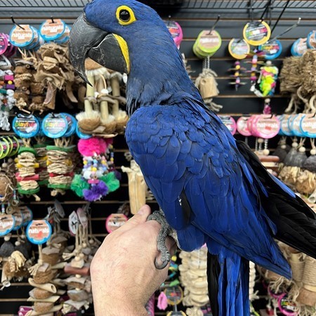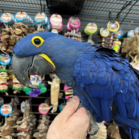 Hand tame very friendly and sweet dna tested female Hyacinth Macaw. Say hi to “DOLLY” she’s is very comical she says hello, come here, peek-a-boo and loves to cuddle. Call us for more info 773-317-3785. ***SERIOUS INQUIRES ONLY***