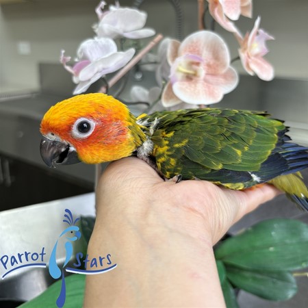 The Sun Conure, also known as the Sun Parakeet, is a small sized parrot species within the family Psittacidae. It is characterized by vibrant yellow plumage with orange and red coloration on the head and body, along with green and blue on the wings and tail. In the wild, Sun Conures inhabit tropical and subtropical forests, savannas, and palm groves across northern South America. They nest in tree cavities and are typically found in small flocks.