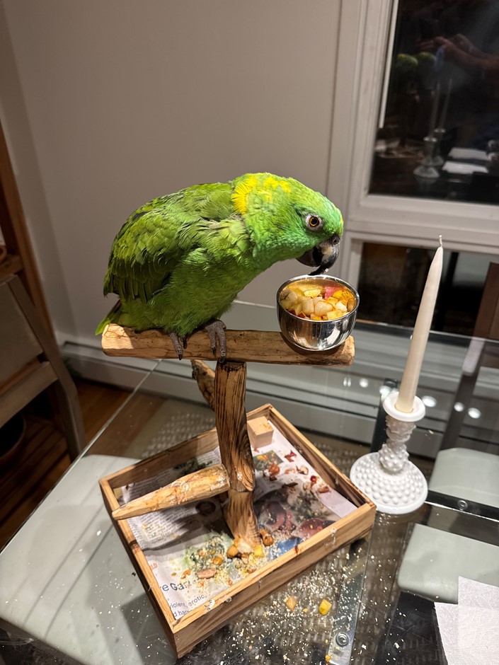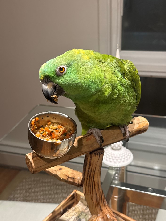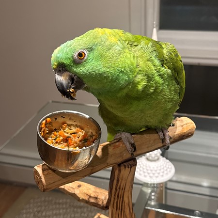 Elfo was recently given to me. He is hand tame but will need time to open up. He steps up and hangs out with you for a little while, though he generally prefers relaxing in his cage or getting veggies and fruits on his perch. He loves fruits and veggies, and he has been eating pellets as well. He’s around 20 years old or so we believe.