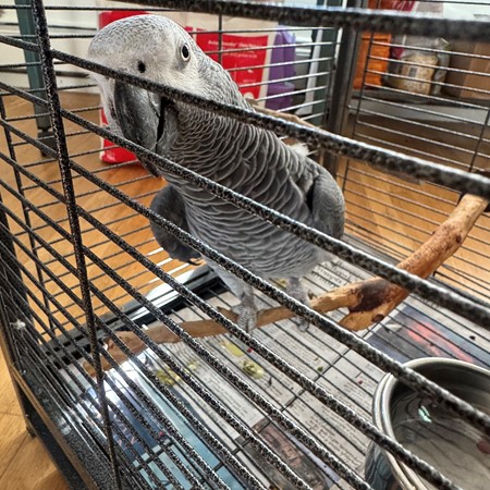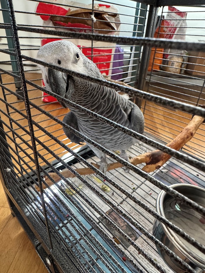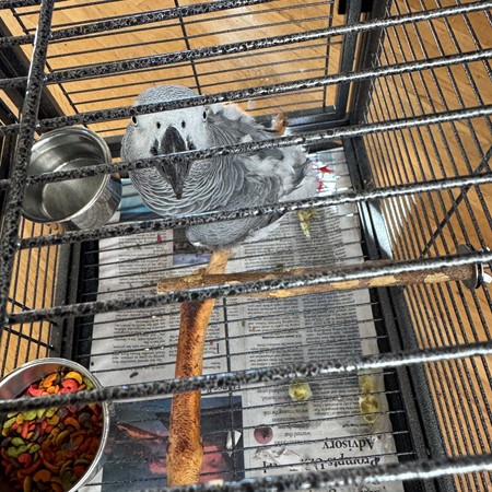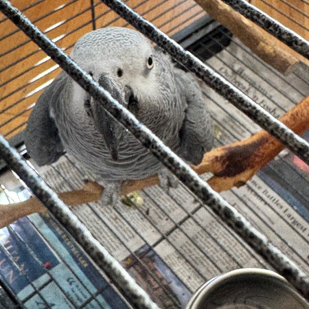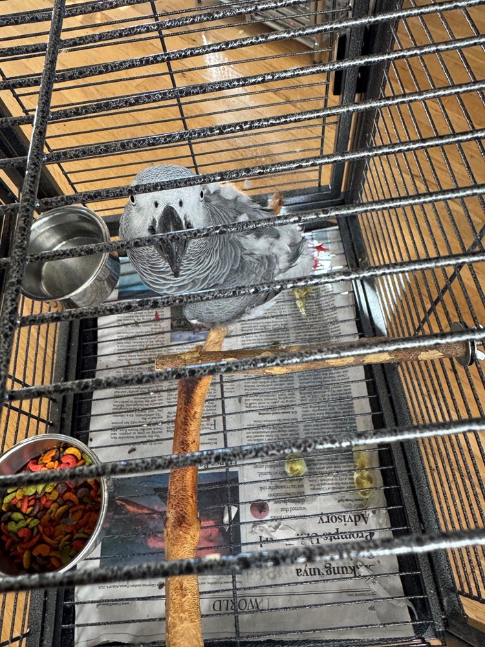 Male African Grey Congo. He is not tame and will probably do best in a breeding situation or with someone who will be comfortable with not handling him. He can possibly be tamed, but it will take significant effort and time since he’s still a pet bird and will let you give him head scratches. He was not previously a breeder. He plucks his feathers a little but overall in good health. He is around 18 - 20 years old.