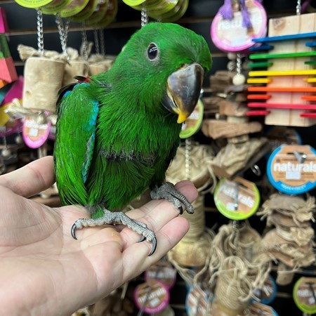 Currently hand feeding is a sweet baby Solomon Island Eclectus male. For more info call 773-317-3785. We are now located at 710 Lee St. Des Plaines Il 60016.