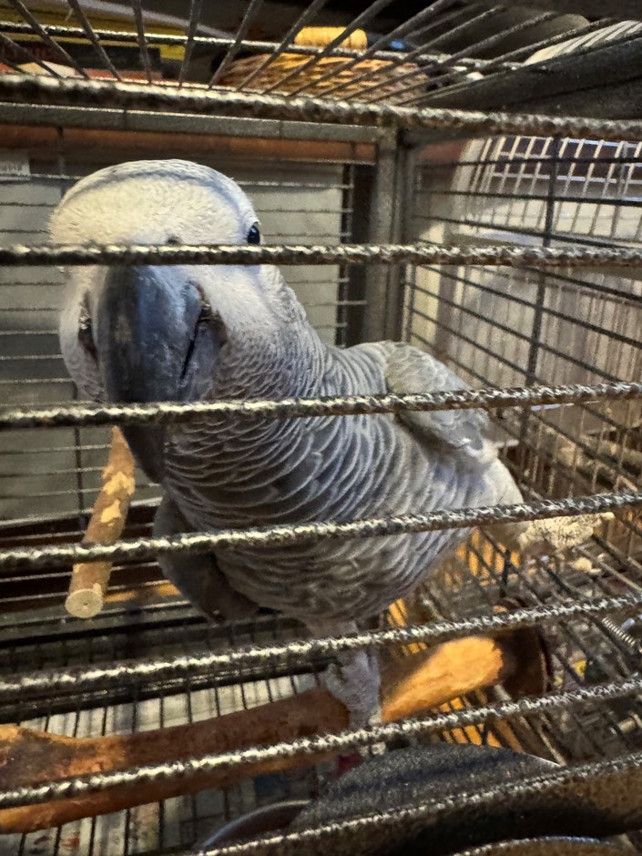 Male African Grey Congo. He is not tame and will probably do best in a breeding situation or with someone who will be comfortable with not handling him. He is a very large bird. He can possibly be tamed, but it will take significant effort and time since he’s still a pet bird and will let you give him head scratches. He was not previously a breeder. He plucks his feathers a little but overall in good health. He is around 18 - 20 years old.