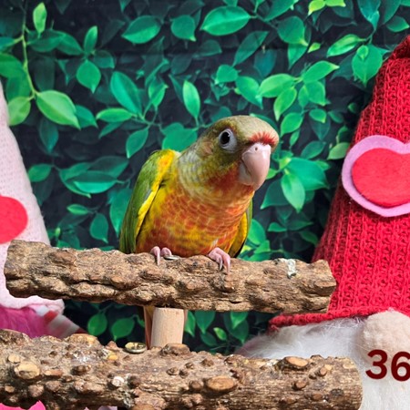 This DNA‑confirmed male Pineapple Green Cheek Conure is officially ready to charm his way into a loving forever family!