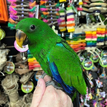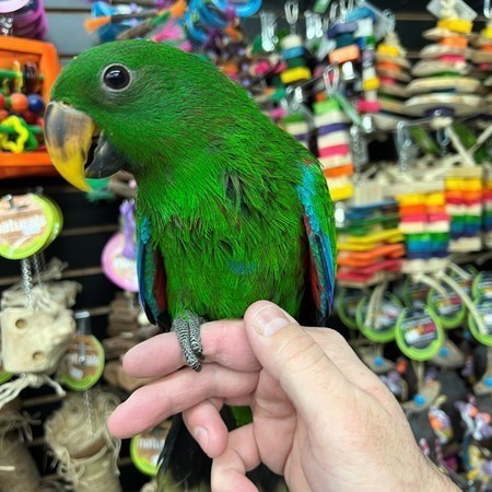Currently hand feeding is a sweet baby Solomon Island Eclectus male. For more info call 773-317-3785. We are now located at 710 Lee St. Des Plaines Il 60016.