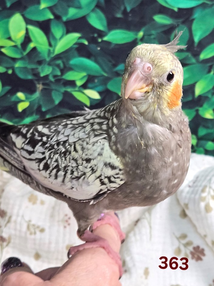 This beautiful Cockatiel, just a baby still, hatched May 2025, and has been hand-fed from a young age, ensuring a sweet and trusting temperament. She is turning out to be very cuddly, enjoying people, snuggles and play time.