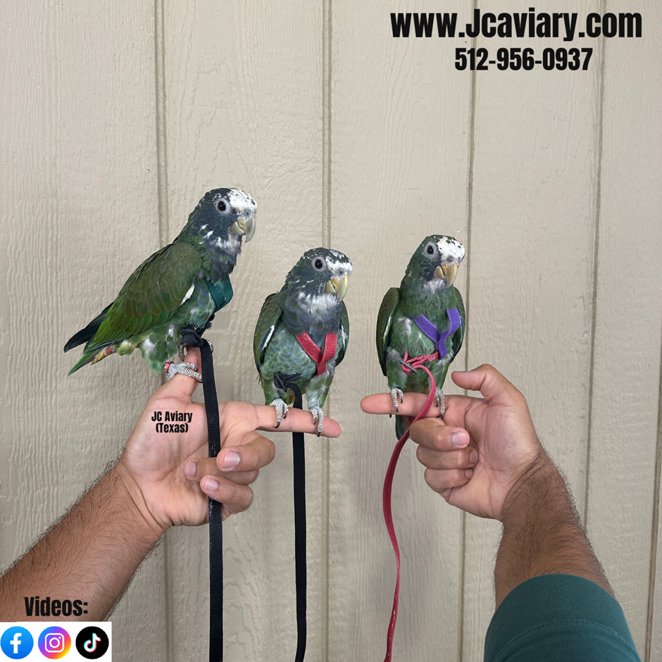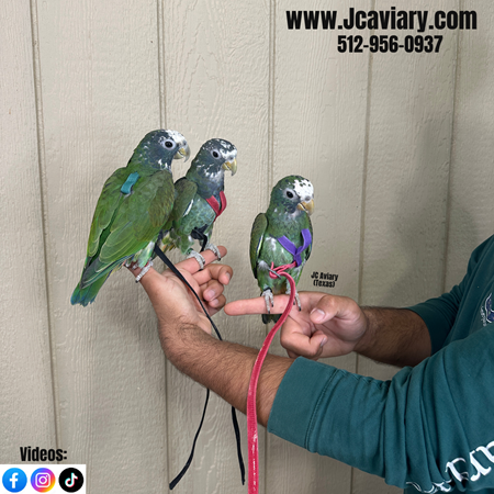 Incredibly sweet and fully trained White capped pionus babies ready now for their forever homes. They are weaned on a healthy diet of organic pellets and vegetables. All our babies are very well socialized, tame and sweet. Please visit our website for full detailed info on these babies -- www.Jcaviary.com-- Please call us to reserve your baby !! 512-956-0937 - Shipping available via Delta Airlines-- All babies are DISEASE TESTED and come with avian vet documents as well. (Deposit: $1500 required to reserve each baby) Videos available on Facebook: https://facebook.com/jcaviary