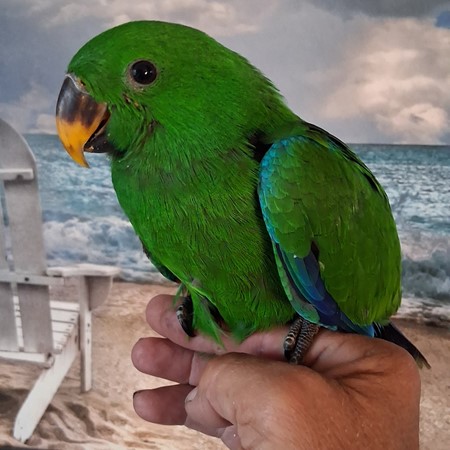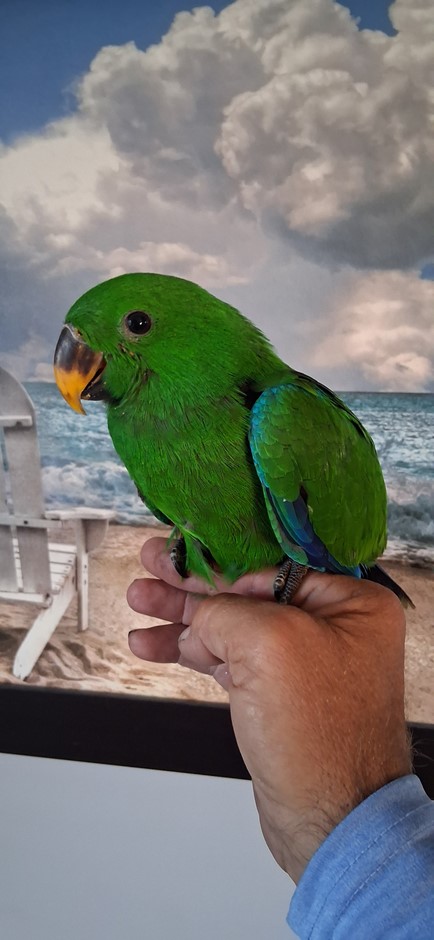 Handfeeding sweet male Solomon Island eclectus baby. Baby will be weaned onto Zupreem natural pellets and mixed veggies. $1250 deposit will hold until weaned.