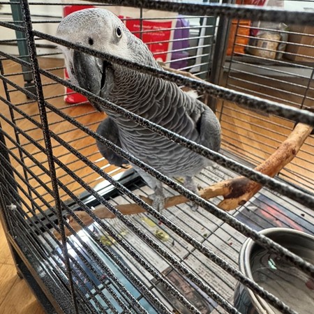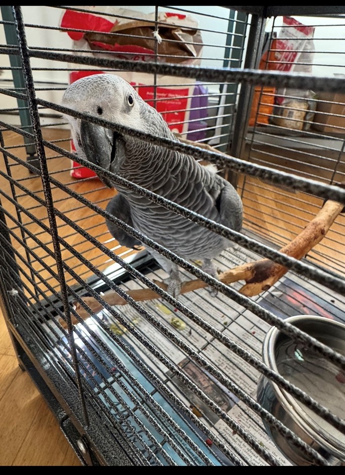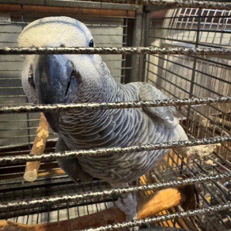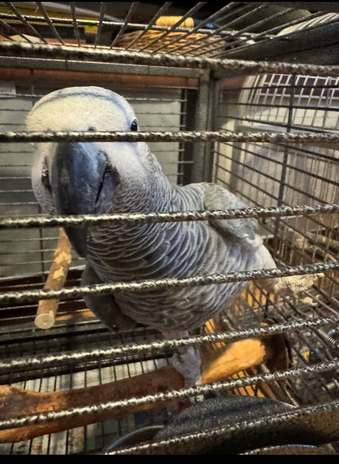 REDUCED ADOPTION FEE ⭐️‼️ Male African Grey Congo. He is not tame and will probably do best with someone who will be comfortable with not handling him. He is a very large bird. He can possibly be tamed, but it will take significant effort and time since he’s still a pet bird and will let you give him head scratches. He was not previously a breeder but could be in the first. He plucks his feathers a little but overall in good health. He is around 18 - 20 years old.