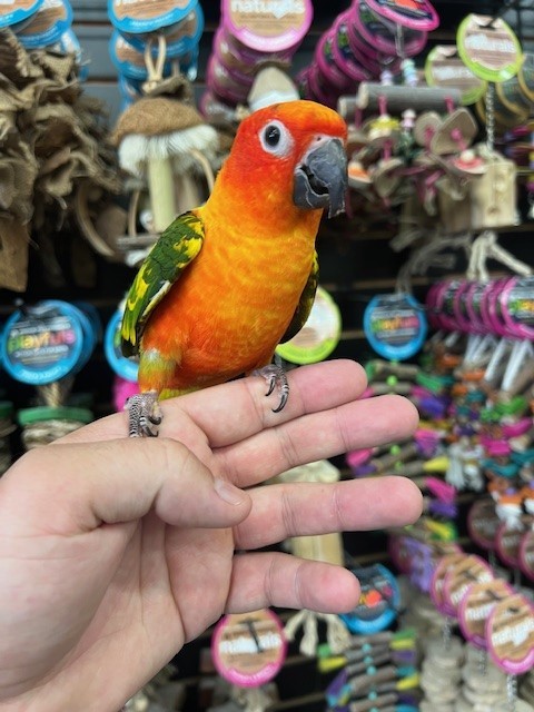 Just weaned is a sweet baby Red Factor Sun Conure. For more info call 773-317-3785. We are located at 710 Lee St., Des Plaines, IL 60016.