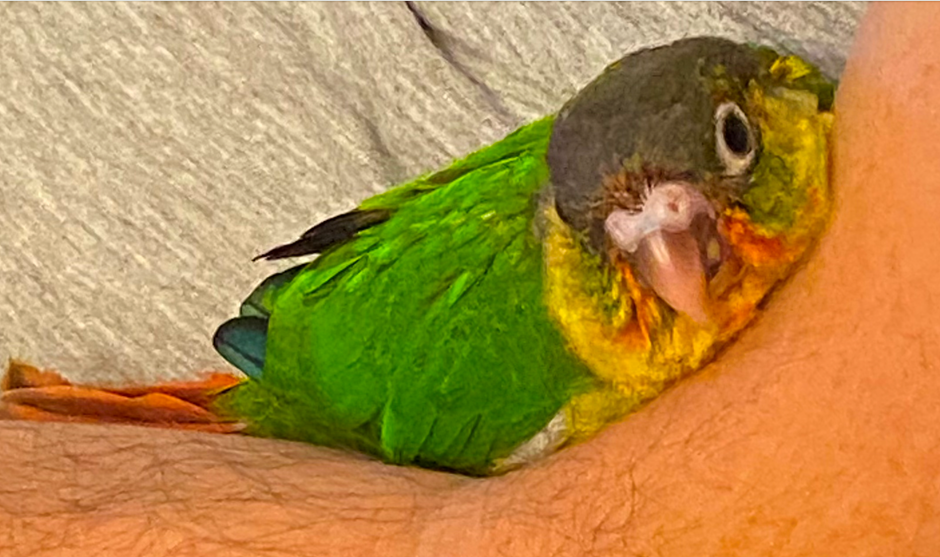 Jasper is an adorable red factor yellow sided green cheek conure. Tame, currently being hand fed, and will be weaned and is ready to go by the end of February. Wellness checked. Well socialized. Parents are tested and disease free. Very curious, loves exploring. Stunning colors, gorgeous little birdie. Local pick up is available. Free cage with local pick up.