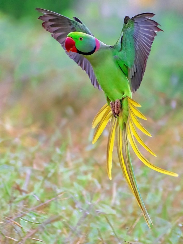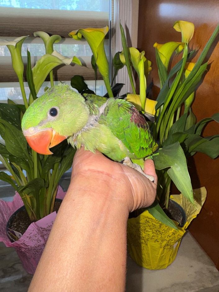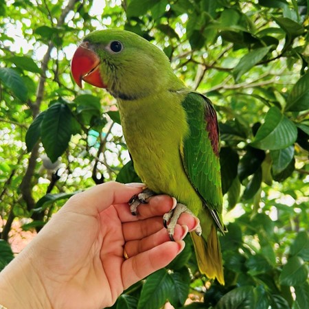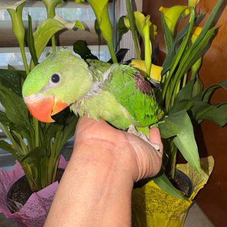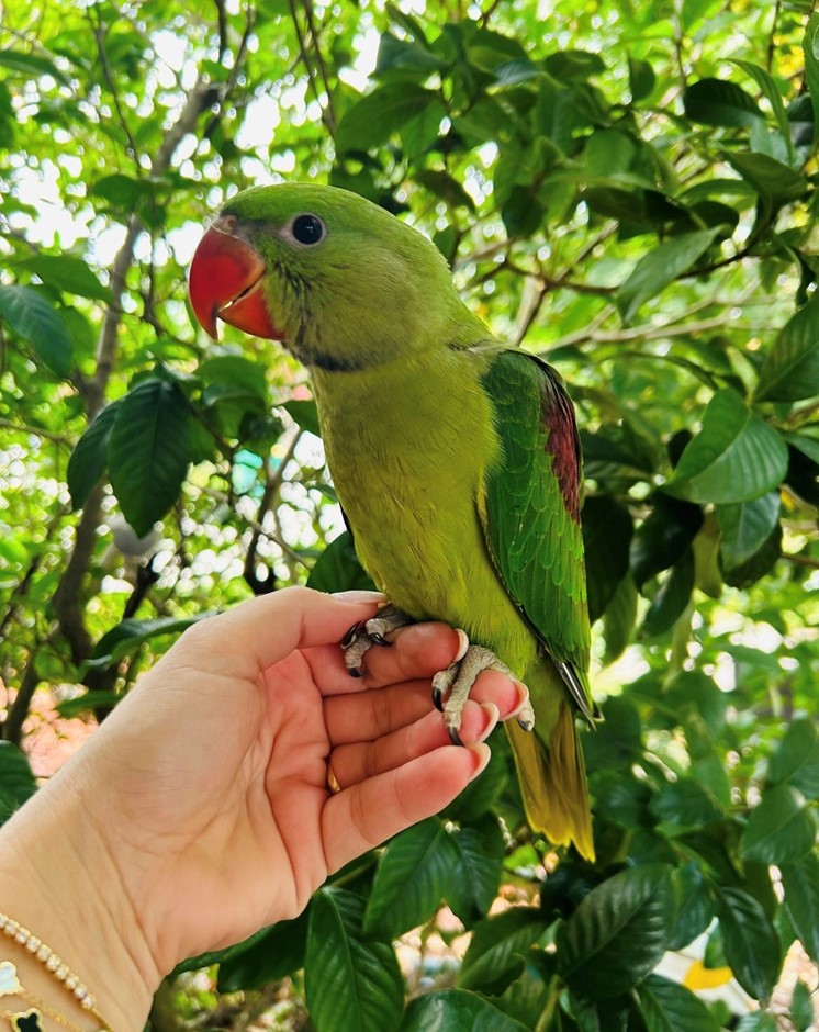 A large, intelligent parrot known for its striking green color, long tail, and gentle personality. Alexandrine parrots are highly trainable, social, and can develop strong bonds with their owners. They are excellent talkers and do well in spacious environments🦜