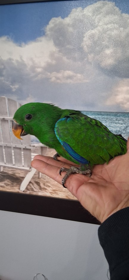 Handfeeding sweet male Solomon Island eclectus baby. Baby will be weaned onto Zupreem natural pellets and mixed veggies. $1250 deposit will hold until weaned.