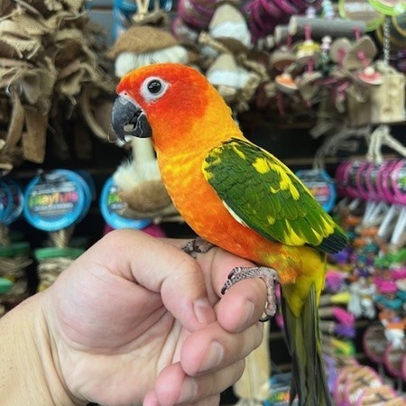 Hand fed baby Red Factor Sun Conure. For more info call 773-317-3785. We are located at 710 Lee St., Des Plaines, IL 60016.