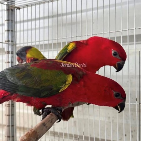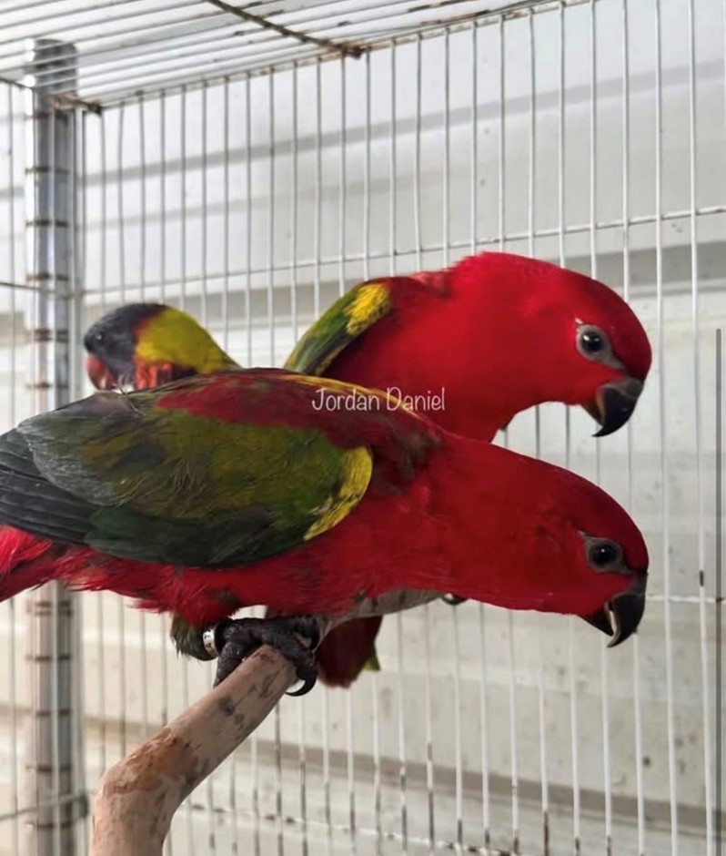Chattering Lories 2025 male & 2024 female. Unrelated pair. Perfect for someone looking to work with a rare species of Lory. Weaned onto my high quality nectar formulas (LoriesChoice.com), low iron fruits and some veggies. Serious inquiries only. Can ship at buyers expense.