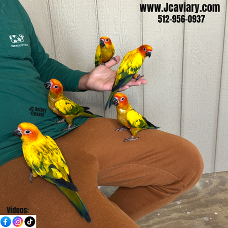 Accepting reservations on these adorable HIGH YELLOW sun conure babies babies. They are STILL being hand-fed but almost weaned. They will be on a healthy diet of organic pellets and vegetables. All our babies are very well socialized, tame and sweet. Please visit our website for full detailed info on these babies -- www.Jcaviary.com-- Please call us to reserve your baby !! 512-956-0937 - Shipping available via Delta Airlines-- All babies are DISEASE TESTED and come with avian vet documents as well. (Deposit: $400 required to reserve each baby) Videos available on Facebook: https://facebook.com/jcaviary