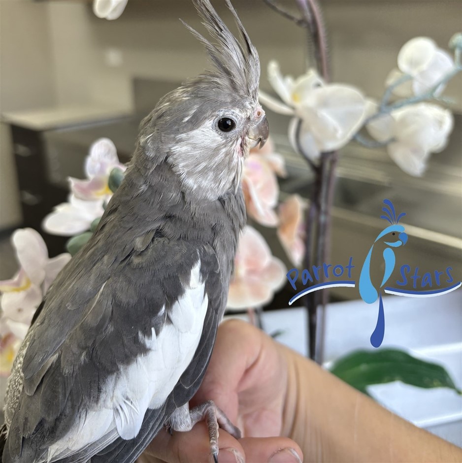 "Scientific Name: Nymphicus hollandicus Native Range: Australia The Cockatiel is a small parrot species and the only member of the genus Nymphicus. It is closely related to cockatoos and shares characteristics typical of the Cacatuidae family, including a prominent crest and powder down. Cockatiels exhibit sexual dimorphism: wild-type gray males generally display brighter facial coloration with a yellow face and orange cheek patches. Wild-type females typically have more muted facial colors, brownish body coloration and barring on the underside of the tail feathers. In the wild, Cockatiels inhabit arid and semi-arid regions of Australia, including scrublands, open woodlands, grasslands, and areas near water sources. They are highly nomadic, often traveling in large flocks. At Parrot Stars, we prioritize education, welfare, and responsible parrot ownership to help ensure every bird finds and thrives in a forever home. Before taking home any parrot, we provide comprehensive guidance on proper caging and setup, positive reinforcement training, household safety, nutrition, and enrichment. Parrots in captivity are still wild animals with all their natural instincts. Your overall success and experience with any species of companion parrot is greatly impacted by positive reinforcement training. A parrot’s behavior reflects both the environment they live in and the training they receive. All of our hand-fed babies are hatched and raised in our own breeding facility and weaned onto a diverse, high-variety diet. Our parrots are never clipped and are fully flighted. Follow our Parrot Stars Podcast to learn all about our parrots, our purchase process, and our philosophy of parrot care."