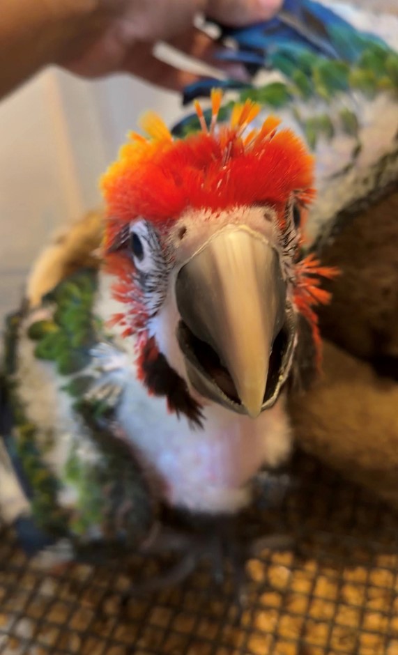 Camelot is a cross between a Catalina and Scarlet macaw. A Catalina is a 1st generation hybrid cross of a Blue and Gold and a Scarlet Macaw.