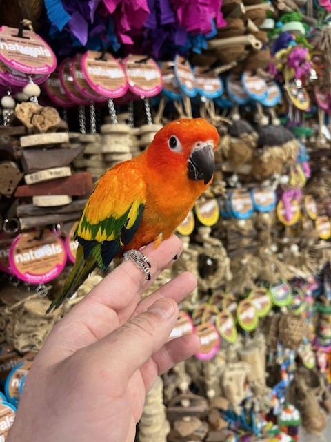 Hand fed baby Red Factor Sun Conure. For more info call 773-317-3785. We are located at 710 Lee St., Des Plaines, IL 60016.