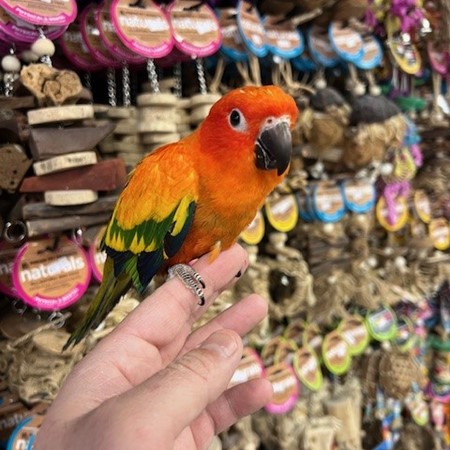 Hand fed baby Red Factor Sun Conure. For more info call 773-317-3785. We are located at 710 Lee St., Des Plaines, IL 60016.