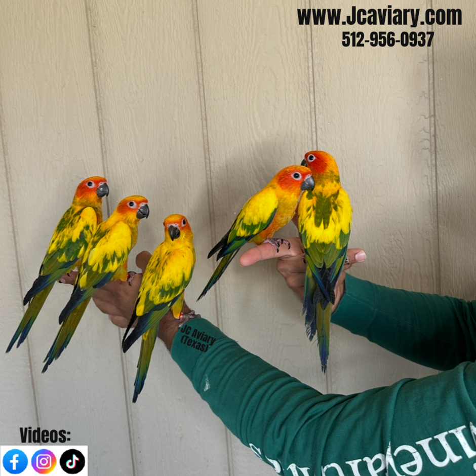 Accepting reservations on these adorable HIGH YELLOW sun conure babies babies. They are STILL being hand-fed but almost weaned. They will be on a healthy diet of organic pellets and vegetables. All our babies are very well socialized, tame and sweet. Please visit our website for full detailed info on these babies -- www.Jcaviary.com-- Please call us to reserve your baby !! 512-956-0937 - Shipping available via Delta Airlines-- All babies are DISEASE TESTED and come with avian vet documents as well. (Deposit: $400 required to reserve each baby) Videos available on Facebook: https://facebook.com/jcaviary