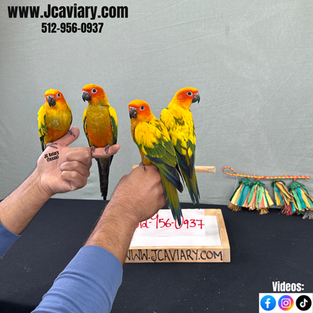 Incredibly sweet, hand-fed, tame and well trained sun conure babies ready now for their forever homes. They are weaned on a healthy diet of organic pellets and vegetables. All our babies are very well socialized, tame and sweet. Please visit our website for full detailed info on these babies -- www.Jcaviary.com-- Please call us to reserve your baby !! 512-956-0937 - Shipping available via Delta Airlines-- All babies are DISEASE TESTED and come with avian vet documents as well. (Deposit: $400 required to reserve each baby) Videos available on Facebook: https://facebook.com/jcaviary