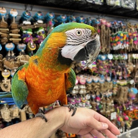 Hand tame and sweet Catalina Macaw Hybrid available. For more info call 773-317-3785. We are located at 710 Lee St. Des Plaines Il 60016.