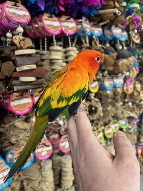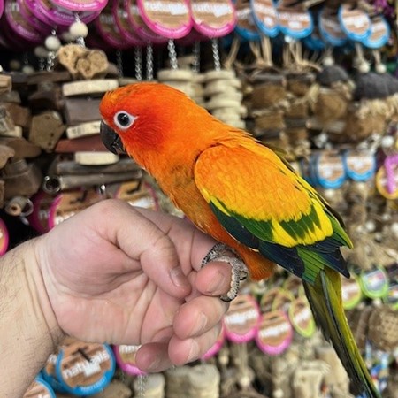 Hand fed baby Red Factor Sun Conure. For more info call 773-317-3785. We are located at 710 Lee St., Des Plaines, IL 60016.