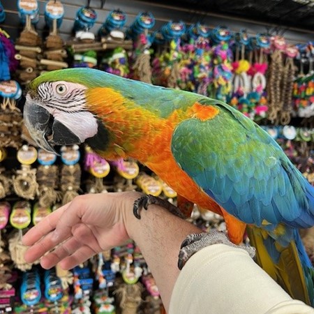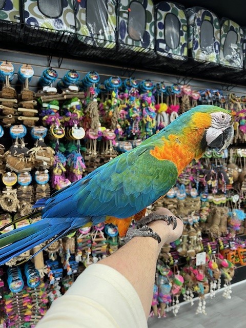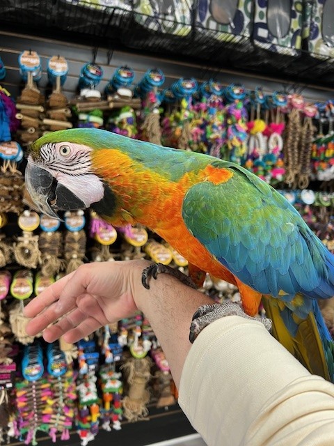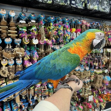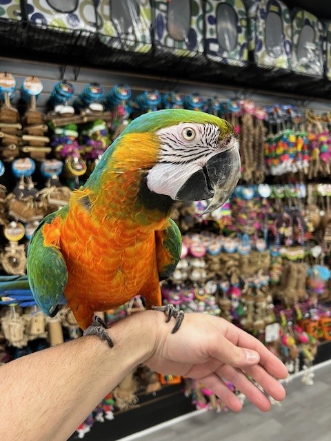 Hand tame and sweet Catalina Macaw Hybrid available. For more info call 773-317-3785. We are located at 710 Lee St. Des Plaines Il 60016.